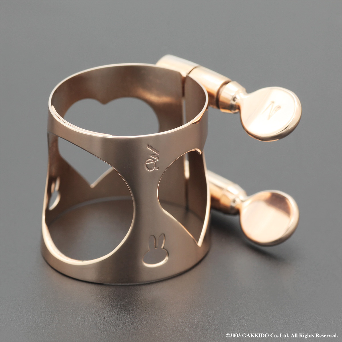 MOMOLIGA B♭クラリネット用リガチャー 洋白製 横型 Babyうさぎ付きハート型 ピンクゴールドメッキ仕上げ